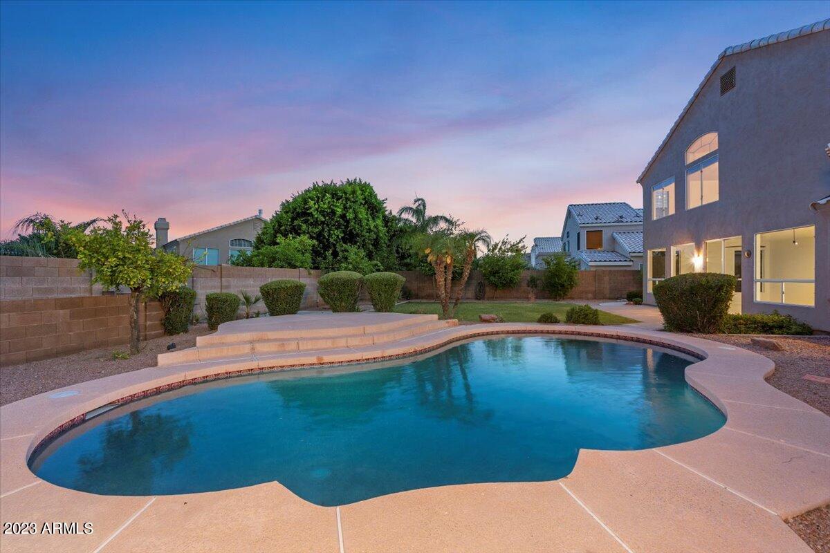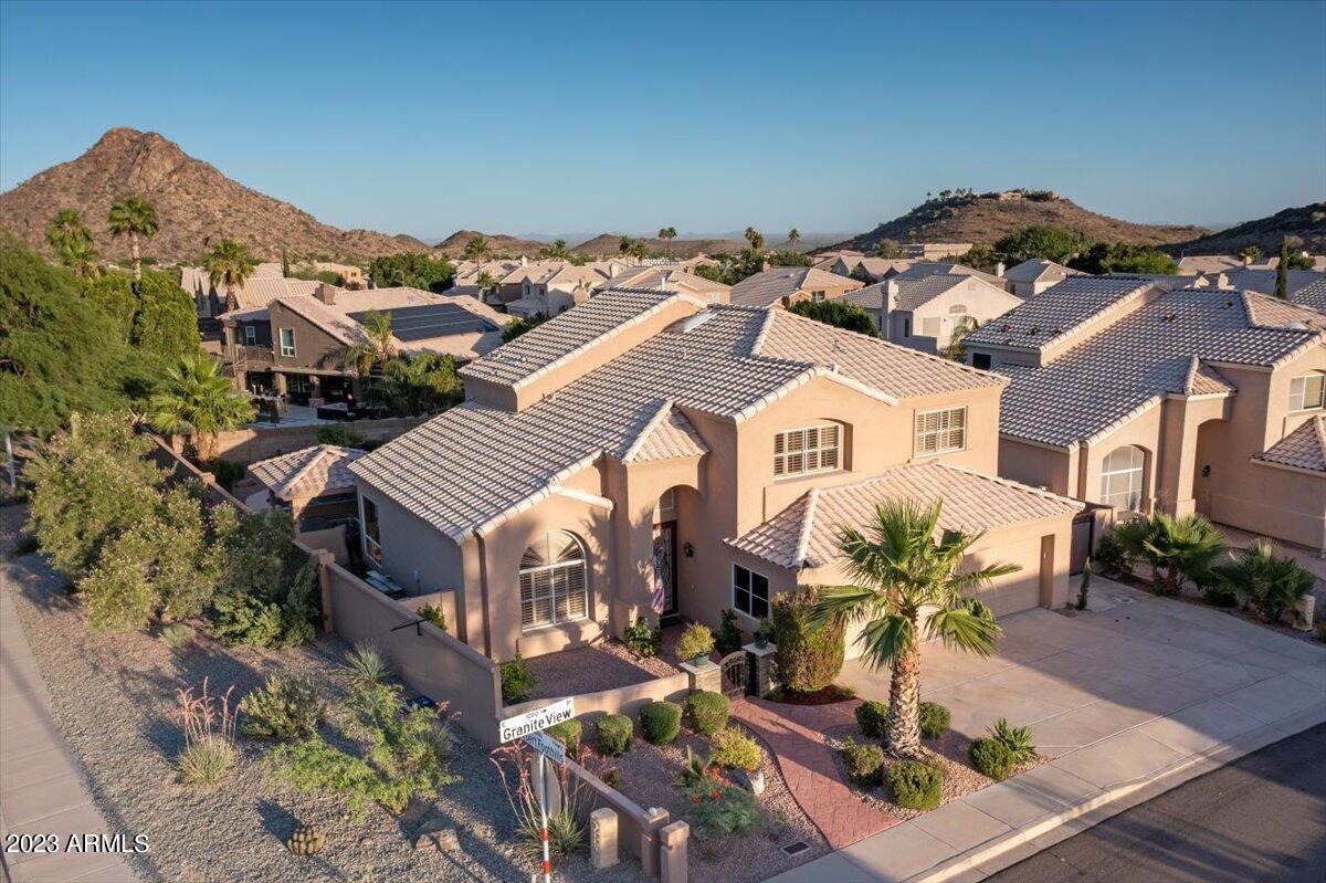 Situated on a premium corner lot in the serene Camelot Ridge Ahwatukee Foothills community, this MOVE-IN READY Sonoran retreat offers panoramic mountain views, a custom RV gate + front courtyard iron gate, easy access to the Loop 202 Fwy, Desert Foothills Park + Trailhead, Telegraph Pass, South Mountain Park, golfing, award-winning schools & more! The open floor plan presents soaring ceilings, plantation shutters, expanded formal dining, oversized windows, a desirable 1st floor bedroom & laundry room. Open-concept chef's kitchen is complete with granite countertops, tile backsplash, large center island, walk-in pantry & ample white cabinetry. The entertainer's dream backyard features an expansive covered patio, a resurfaced 6' deep heated Pebble Tec pool, above-ground jacuzzi sheltered -- by a resort-style pergola, citrus + pomegranate trees & plenty of room to play. Enjoy a low association fee, 3-car garage, large driveway, ADT home security & so much more! Don't miss your chance, this gem won't last long!