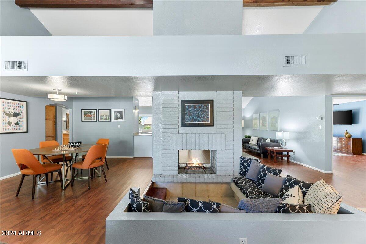 stamped concrete front patio.. Enter into an open flrplan w/ vaulted ceilings & 2- way fireplace, separating the living rm from family rm. The generous master suite is complete w/ arcadia door to back yd & spacious walk -in closet.& master bath w/ soaring ceilings, double vanity w/ slate countertops, jacuzzi tub & snail tiled shower. Other side of home includes 3 bedrms & updated bath w/ double vanity & granite countrtps.. The 4th bdrm is HUGE w/ entry to patio. Kitchen has white cabinets w/ large pantry & breakfast bar.opening to family rm. Improvements include wood- like floors, Trane AC in 2017, roof redone in 2018, pool pebble tec in 2021. Bkyd has pool & synthetic grass. Spa inoperable.
