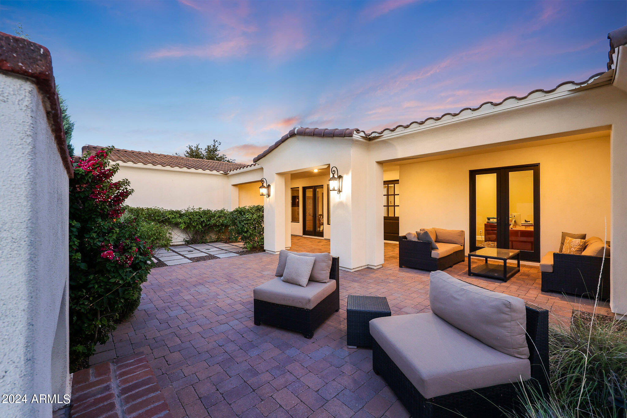 This stunning Santa Barbara-inspired home blends soft contemporary style with impressive curb appeal and a charming front courtyard featuring a wood-burning fireplace. Inside, the open floor plan boasts 14-foot ceilings, an abundance of natural light, a luxurious primary en-suite and home office on one side, and four en-suite bedrooms on the other. The chef's kitchen is a highlight with a large island, quartz countertops, and top-of-the-line Sub Zero/Wolf stainless steel appliances. The primary en-suite is a retreat with a generous walk-in closet and elegant marble finishes. Outside, the backyard is a true oasis with a Pebble Tec pool and spa, a grassy play area, and a sports court. Completing the home is a four-car garage with a convenient charging station, making this property a stand-out in luxury and style.