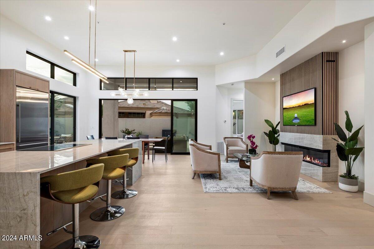 Meticulously remodeled & re-architected 3 bd + ofc, w/exceptional attention to detail. No expense spared in this complete redesign. Finishes include ~300 sq. ft. of additional living space, an additional ensuite bedroom, walk-in closet, wide-plank engineered hardwood, and custom cabinetry to create casual elegance in this prestigious Scottsdale location. With Wolf/Subzero/Cove appliances, dual-zone wine/bev cooler, Taj Mahal quartzite waterfall island & fireplace, 14' Anderson multidoor slider, all new sliding glass doors, luxurious walk-in closet, spa-like primary bath with a romantic shower for two, high-end Brizo primary bath fixtures, smart toilet and resin stone tub, this house is truly a one-of-a-kind turn-key renovation in the highly scouted Gainey Ranch Golf Community. Convert the office into a fourth bedroom. This house has an impressive backyard with Coyote built-in BBQ, side burner, LP firepit, patio deck paved with ivory travertine, walkways etched by pet-friendly heavyweight artificial turf, complemented by the multi-million-dollar updated GRCA community pool, tennis/pickleball courts, and first-class recreation facilities, this model home will appeal to the discerning buyer. New roof double underlayment, new Trane dual AC units, new water heater, 60 Amp electric car charger, 2nd laundry stack hookup in primary bath, the feature list includes so much more.